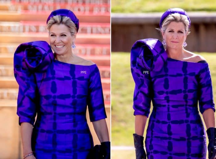 Mijn absolute favoriet dook op in Zuid-Afrika, waar Máxima een dieppaarse jurk met een subtiel blokkenpatroon droeg van modehuis Natan. De halslijn, de schouderdecoratie die uitvloeit in een aangesloten mouw, de glans van de stof, het bijpassende hoedje, het mooie kapsel, de fonkelende oorbellen: deze look krijgt van mij een tien.
