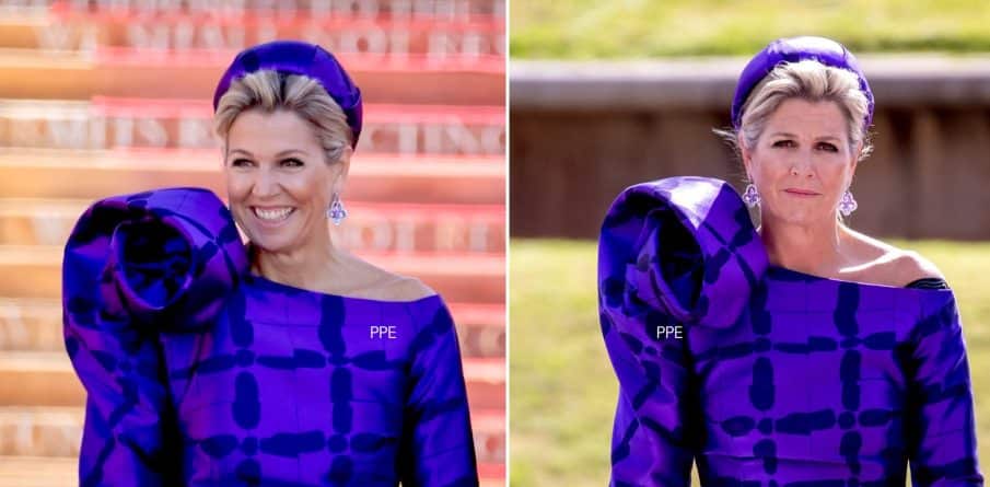 Paars staat haar goed. Of Maxima nou direct macht moet uitstralen, dat lijkt me niet. Meer stabiliteit en rust met af en toe een verrassende look. Volop investeren is ook niet nodig, er hangen talloze paarse outfits in haar kast, zo veel dat het in 2023 bijna haar lievelingskleur leek te zijn. Ik weet dat jullie het saai vinden maar met een mode industrie die een van de grootste vervuilers van de wereld is, stel ik voor dat er opnieuw gedragen en anders gecombineerd wordt. Paars staat haar echt goed hoewel de eerste Natan op de linkerfoto wel een ‘error’ in design laat zien bij haar bovenarm en ik benieuwd ben of de draaikolk op haar rechterschouder er ook af zou kunnen of als een volant naar achter zou kunnen hangen? Ik vind de Balmain leuk, wel graag anders gecombineerd maar als dat echt bont is: fijn privé dragen: volkomen verkeerd imago. Broekpak van Zara (hoe dat ooit outfit van het jaar heeft kunnen worden is mij een raadsel) mag best nog een keer maar graag met friswit of zo. Die haarband snel in de zak van max (en dan niet die van haarzelf). Laatste pakje vind ik wel wat gedateerd maar misschien anders gestyled en rok verlengd kan het nog eens. Kan de tas ook nog eens tevoorschijn komen. Dan heeft ze nog minimaal 10 andere stelletjes, blouses, pantalons, rokken, jassen, sjaals etc. in fel-paars, lila, lavendel, dieppaars, roze-paars – noem maar op. De keuze is reuze (in haar eigen kast) dus ik zou zeggen: lekker shoppen op Huis ten Bosch.