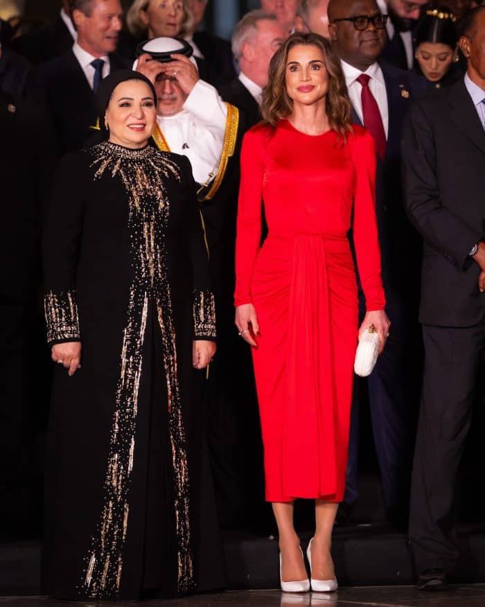 Koningin Rania zagen we in een felrode midi jurk met organza rokgedeelte (label: Dolce & Gabbana). Haar dochter, prinses Salma, koos voor een zwarte jurk van Maison Alaia.