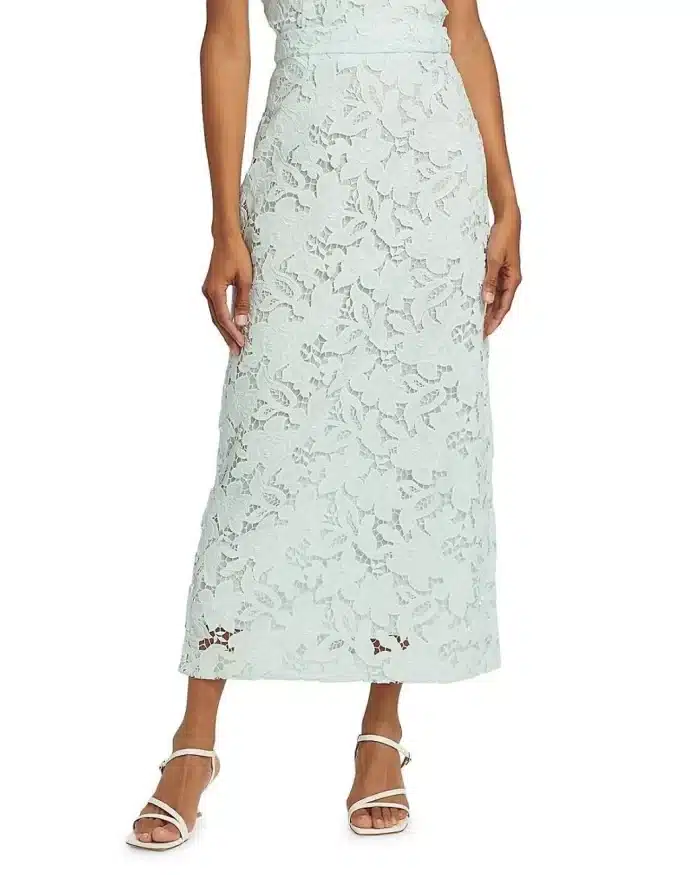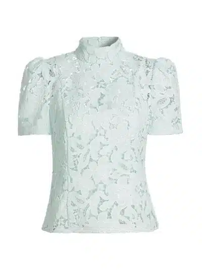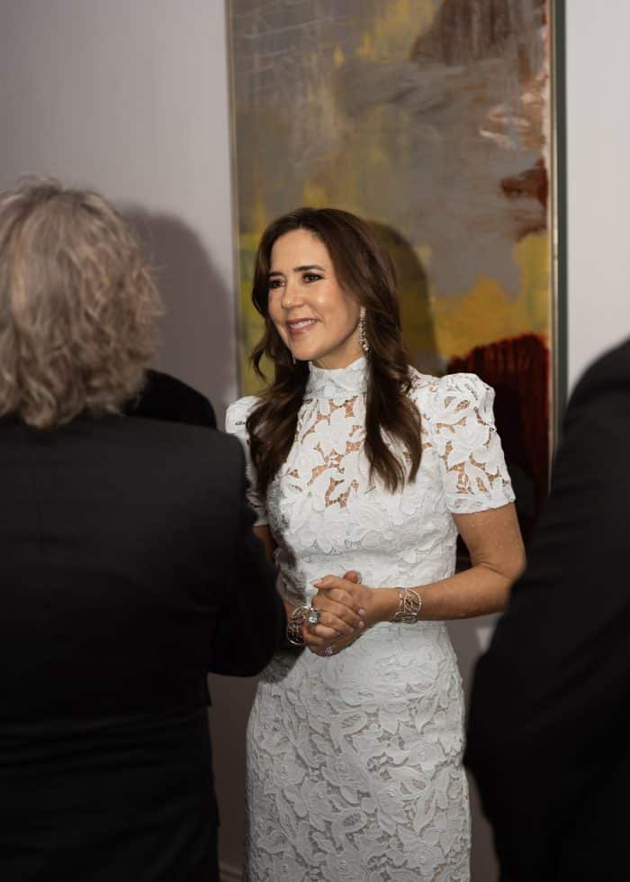 Koningin Mary koos voor de receptie voor een nieuwe mintkleurige kanten deux pieces, bestaand uit een rok en een top met korte mouwen (label: Zimmermann). Haar diamanten oorhangers komen van Bruun Rasmussen. Voor haar clutch ging Mary opnieuw voor een Australisch label: Lin8.