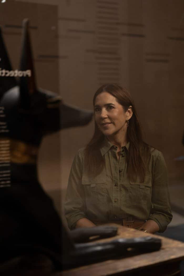 Na het bezoek aan de piramides, gingen de koningin en minister van Buitenlandse Zaken Lars Løkke Rasmussen terug aar het Grand Egyptian Museum, waar onder andere het grafmasker van Toetanchamon te zien is. Hier zagen we Mary in een khaki blouse met een khaki broek met wijde pijpen (label beide kledingstukken: Zimmermann).