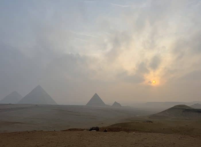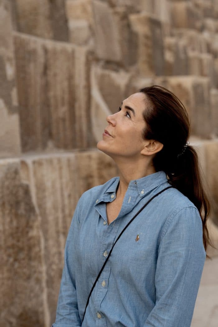 Gisteren bezocht Mary het piramidecomplex van Gizeh. De zon kwam ’s ochtends vroeg op boven de iconische monumenten en de Sfinx. Het complex bestaat in totaal uit negen piramides. Tijdens haar bezoek kreeg de koningin de gelegenheid om de piramide van Cheops te betreden, die ook wel de grootste van de negen piramides wordt genoemd. Het is het enige van de zeven wereldwonderen uit de klassieke oudheid dat nog steeds bestaat. Mary droeg bij dit bezoek een denim blouse van Polo Ralph Lauren op een lichte broek.