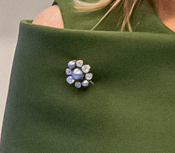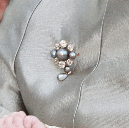 De broche werd eerder ook al wel gedragen met een hanger met twee grijze parels.