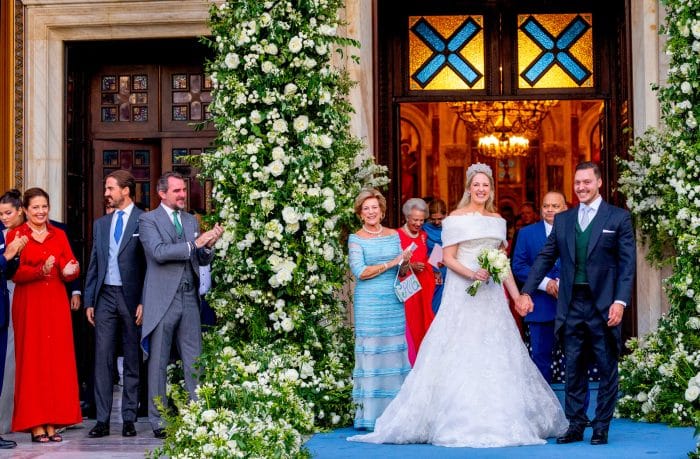 Het huwelijk van Theodora en Matthew werd in 2020 uitgesteld in verband met de coronapandemie. De bruiloft werd in 2023 opnieuw gepland, maar een maand voor het huwelijk overleed Theodora’s vader, waarna de bruiloft opnieuw uitgesteld werd. De japon die Theodora vandaag draagt, is echter wel de japon die ze al heeft laten maken voor haar huwelijk in 2020. Het is ook een prachtig ontwerp, deze A-lijn japon die is bedekt met duizenden kleine kraaltjes. De ontwerpster is één van de belangrijkste mode ontwerpsters in Griekenland. Ze is eigenares van 1 van de oudste modehuizen van Griekenland (opgericht in 1906).