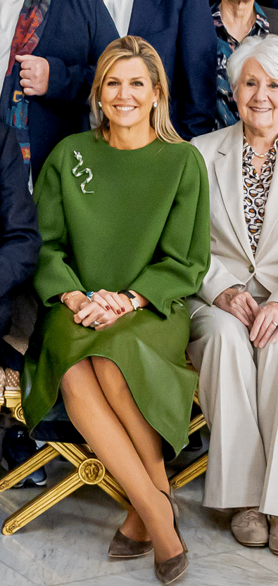 Voor de lunch koos Máxima een outfit in haar favoriete kleur: groen. De top en rok komen van het Belgische modehuis Natan.