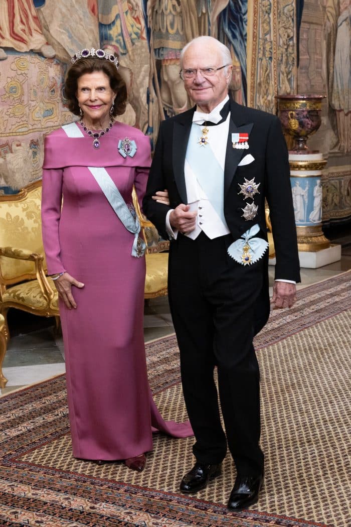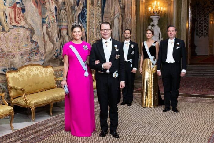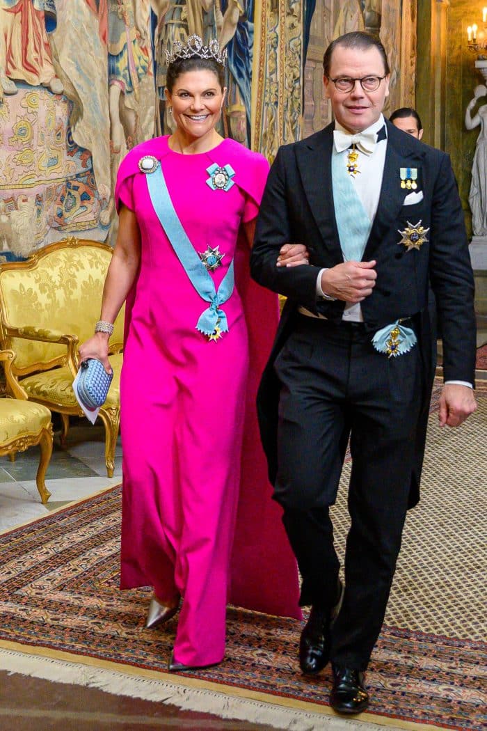 Kroonprinses Victoria gaat tijdens het diner gekleed in haar fuchsia roze galajapon met korte overslagmouwtjes. Ontwerper: