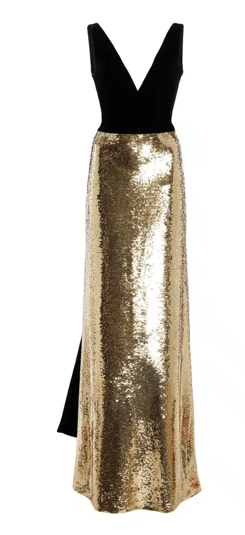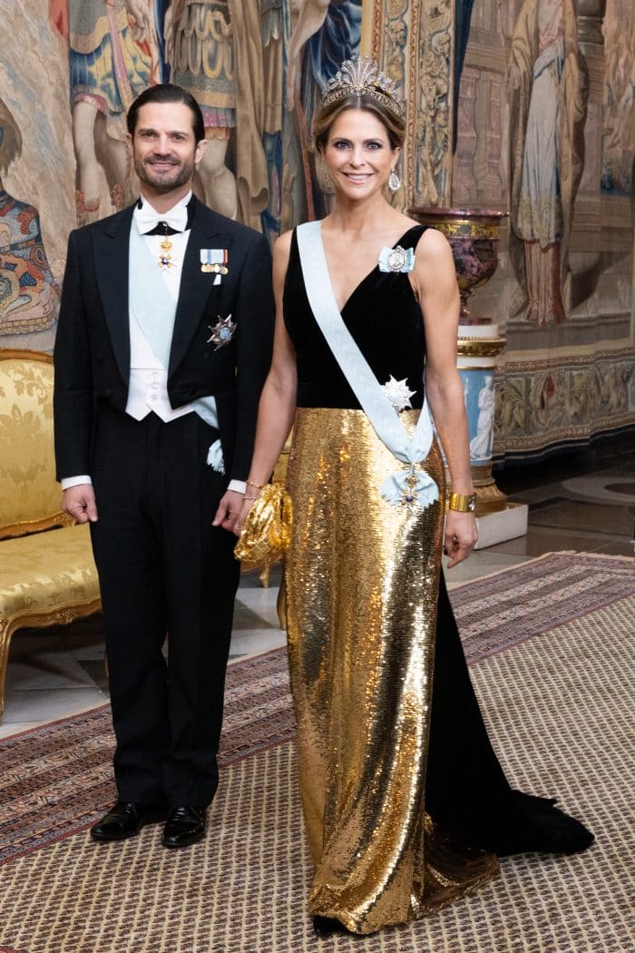 Prinses Madeleine draagt een japon met een goudkleurige rok, die bezaaid is met pailletten. De bovenkant van de galajapon bestaat uit een eenvoudige zwarte fluwelen top met een diepe v-hals. De achterzijde van de japon heeft een zwarte fluwelen sleep. Ontwerper: Monique l’Huillier.