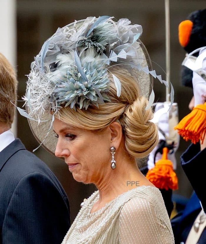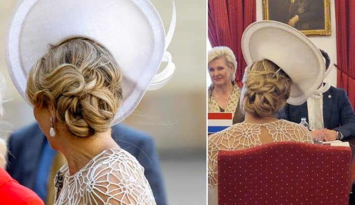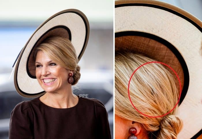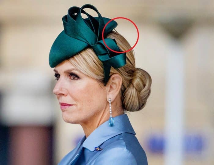 Laten we beginnen met de kleine cocktailhoedjes, die Máxima de laatste tijd veel draagt. Het lijkt misschien alsof de hoed met een magische hoedenlijm op de juiste plek is geplakt, maar in werkelijkheid worden ze verankerd met een haarband. Het hoedje is dus verankerd aan de haarband en zolang die haarband maar op Máxima’s hoofd blijft zitten, blijft het hoedje ook op z’n plek. Om het hulpmiddel zo onzichtbaar mogelijk te maken, zijn ze vaak in de kleur van haar lokken uitgevoerd.