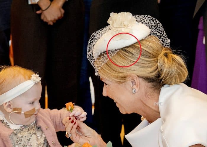 Máxima’s witte cocktailhoed van Philip Treacy werd met een paar extra schuifjes vastgezet. Op onderstaande foto piept één schuifje net onder de hoed uit.