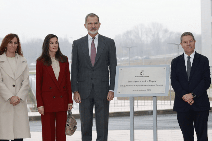 Bij de opening van een nieuw ziekenhuis op 19 december, is koningin Letizia ook al in kerstsferen qua kleding. Ze kiest voor een warmrood broekpak.