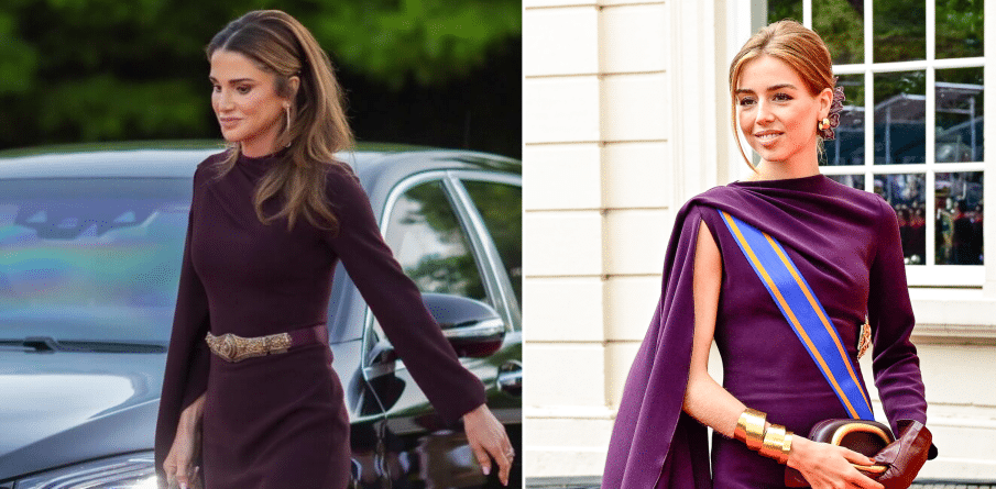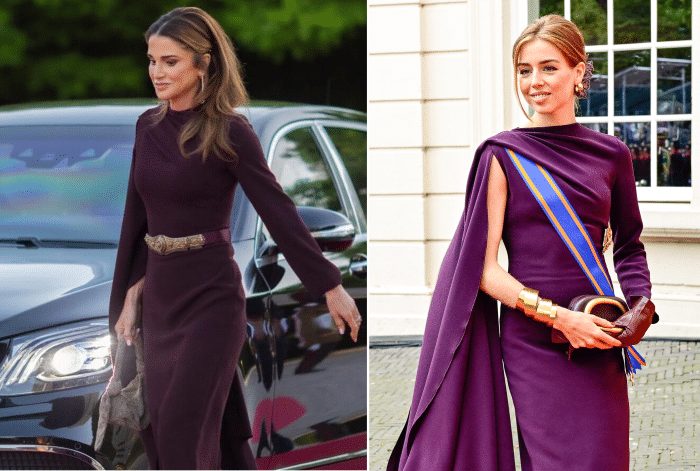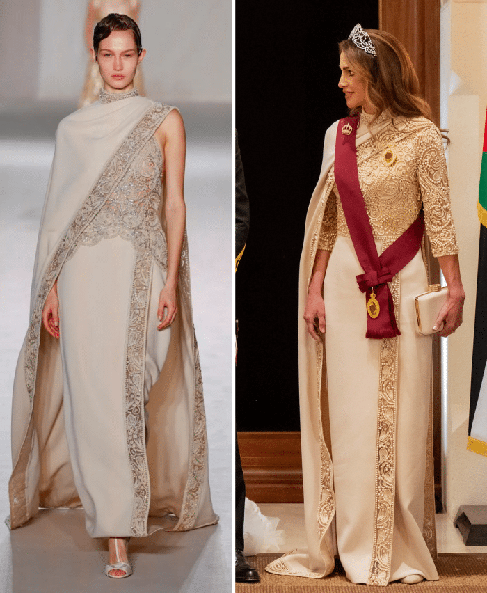 Voor de 78e Nationale Dag van Jordanië bestelt Rania bij het Britse modehuis Solace London. Het asymmetrische ontwerp toont aan de rechterzijde een zwierige cape én blote arm. Bij het oorspronkelijke ontwerp althans, zoals het door Alexia wordt gedragen op Prinsjesdag 2025. Voor koningin Rania wordt de zwierige capemouw naar binnen toe geslagen en daar vastgezet, zodat haar arm niet meer bloot is.