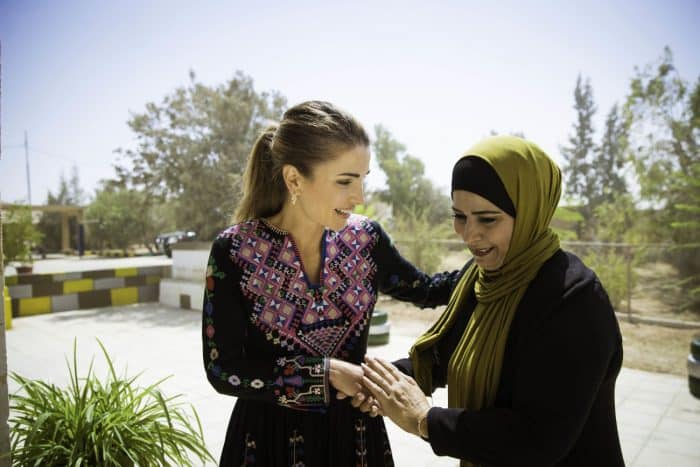 Daarnaast draagt koningin Rania ook regelmatig kleding met ‘een vleugje traditie’ of een knipoog naar de traditionele kleding. Hieronder zien we Rania met een witte blouse met daarop een vrouw afgebeeld in traditionele kleding.