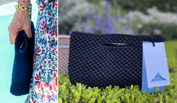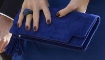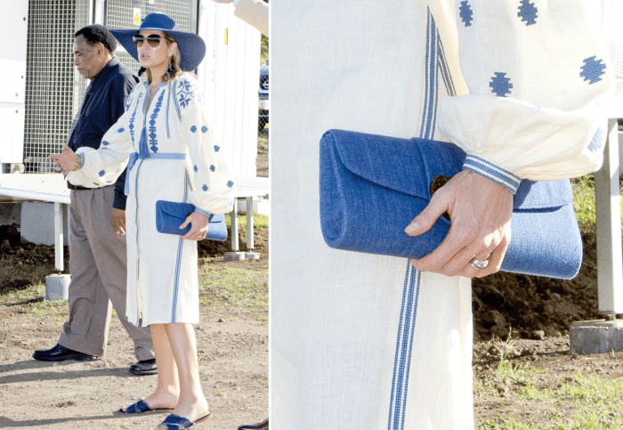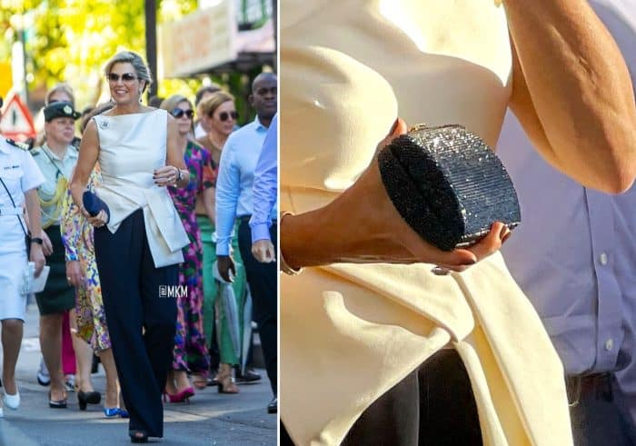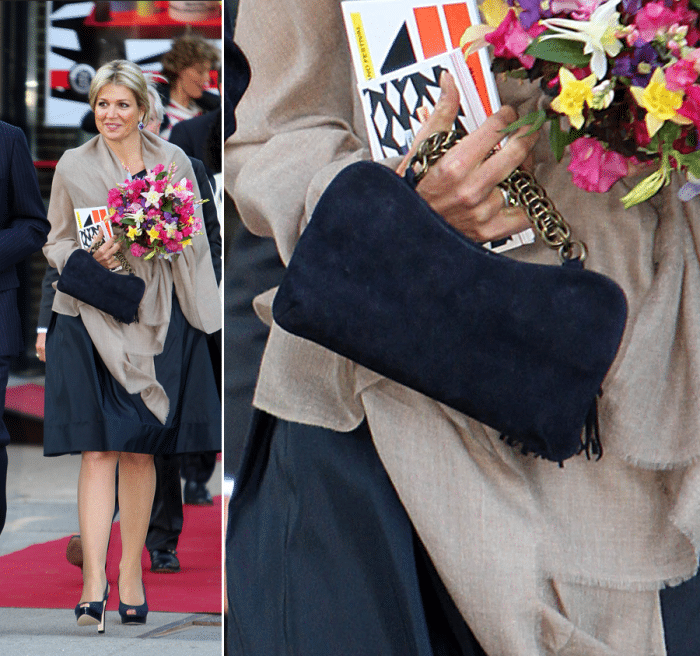 In 2023 introduceerde Máxima ook een flapover clutch van donkerblauw leer. De flap is glanzend leer, de body is van suede. Het betreft een ontwerp van Natan.