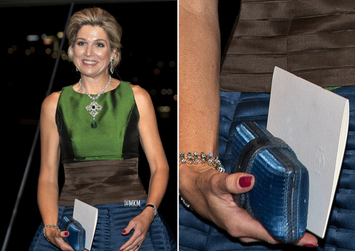 Bij haar goud-blauw avondtoilet van Claes Iversen draagt Máxima steevast een zijden tasje met striksluiting. Een cadeautje van de ontwerper?