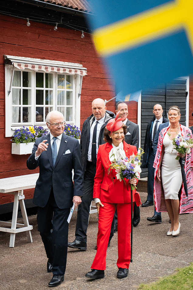 Koning Carl Gustaf en koningin Silvia begonnen de festiviteiten van de Nationale Feestdag dit jaar met een bezoek aan Nybro in Kalmar. Bij aankomst werden ze ontvangen door gouverneur Allan Widman en zijn vrouw Helen Widman.